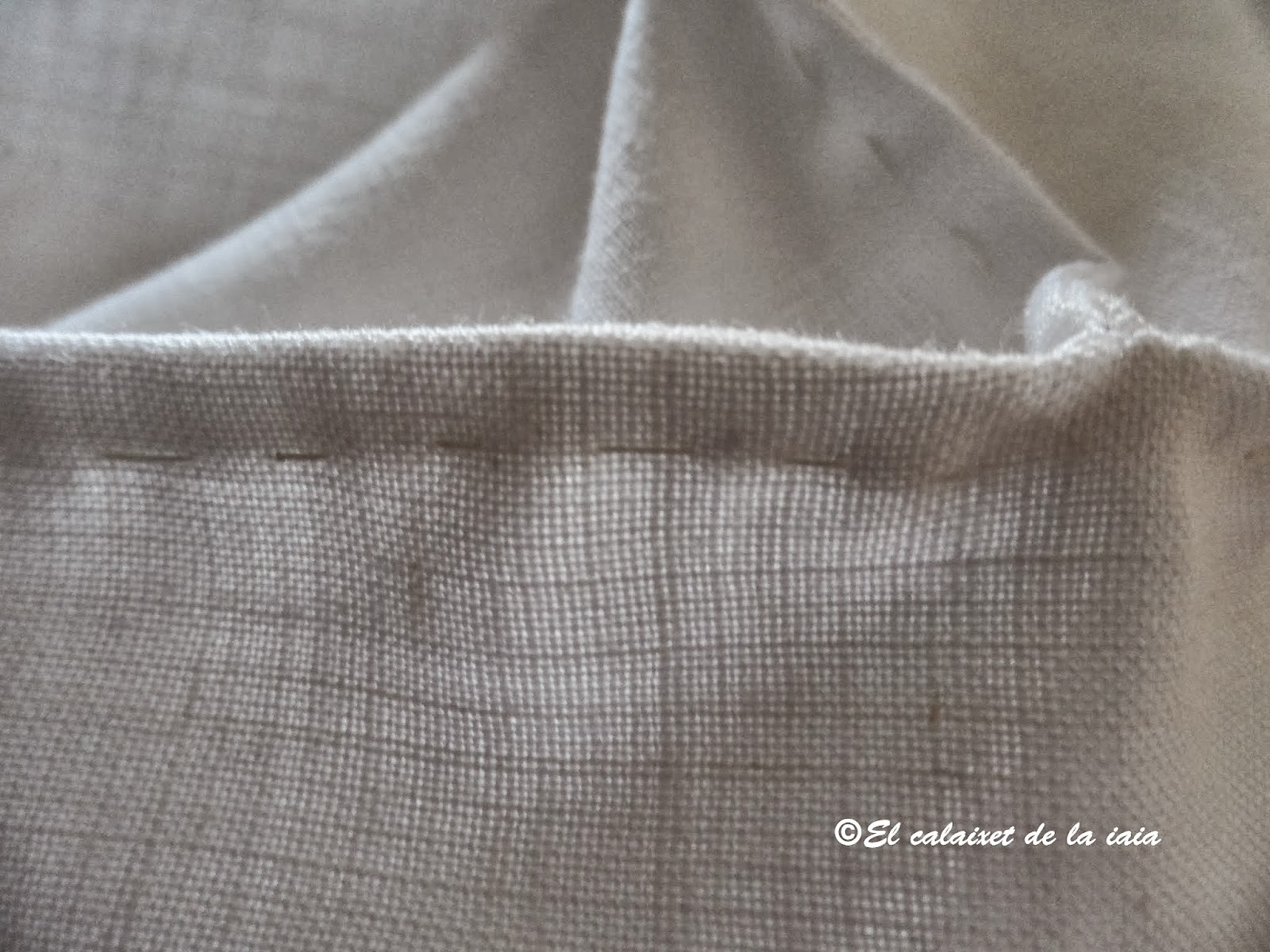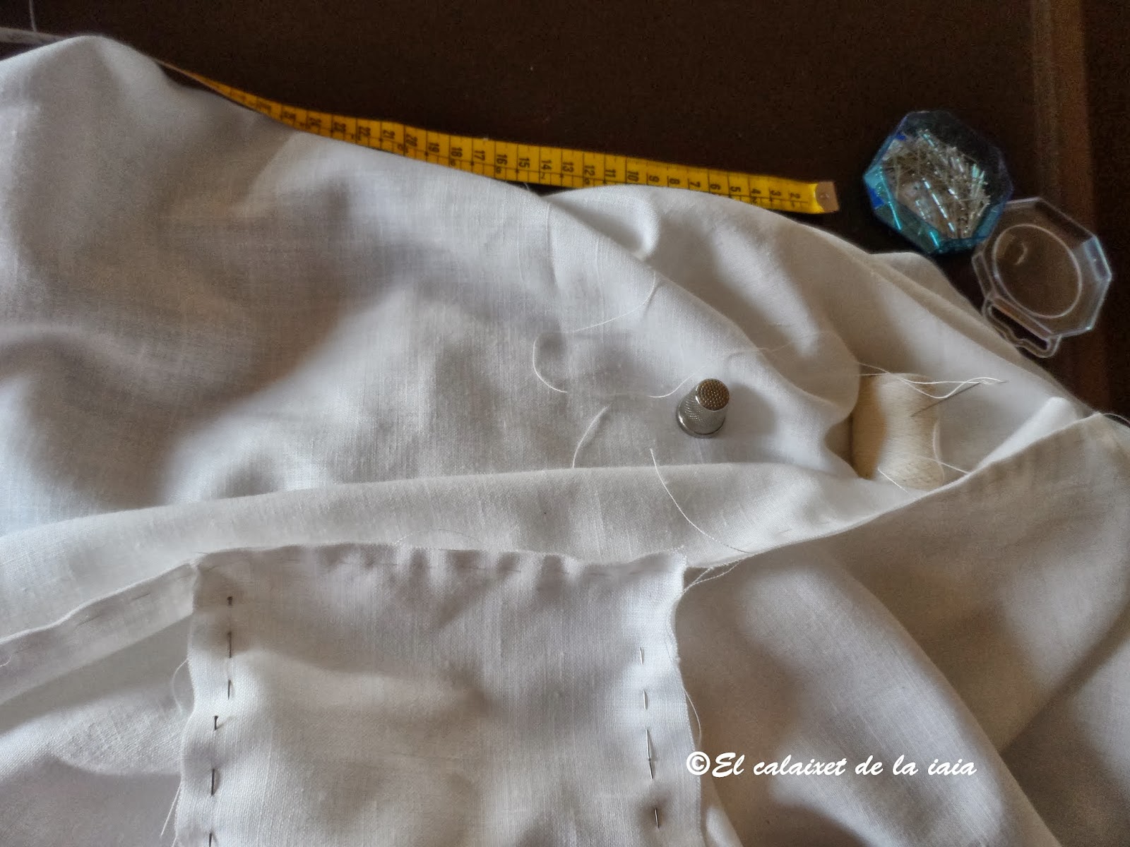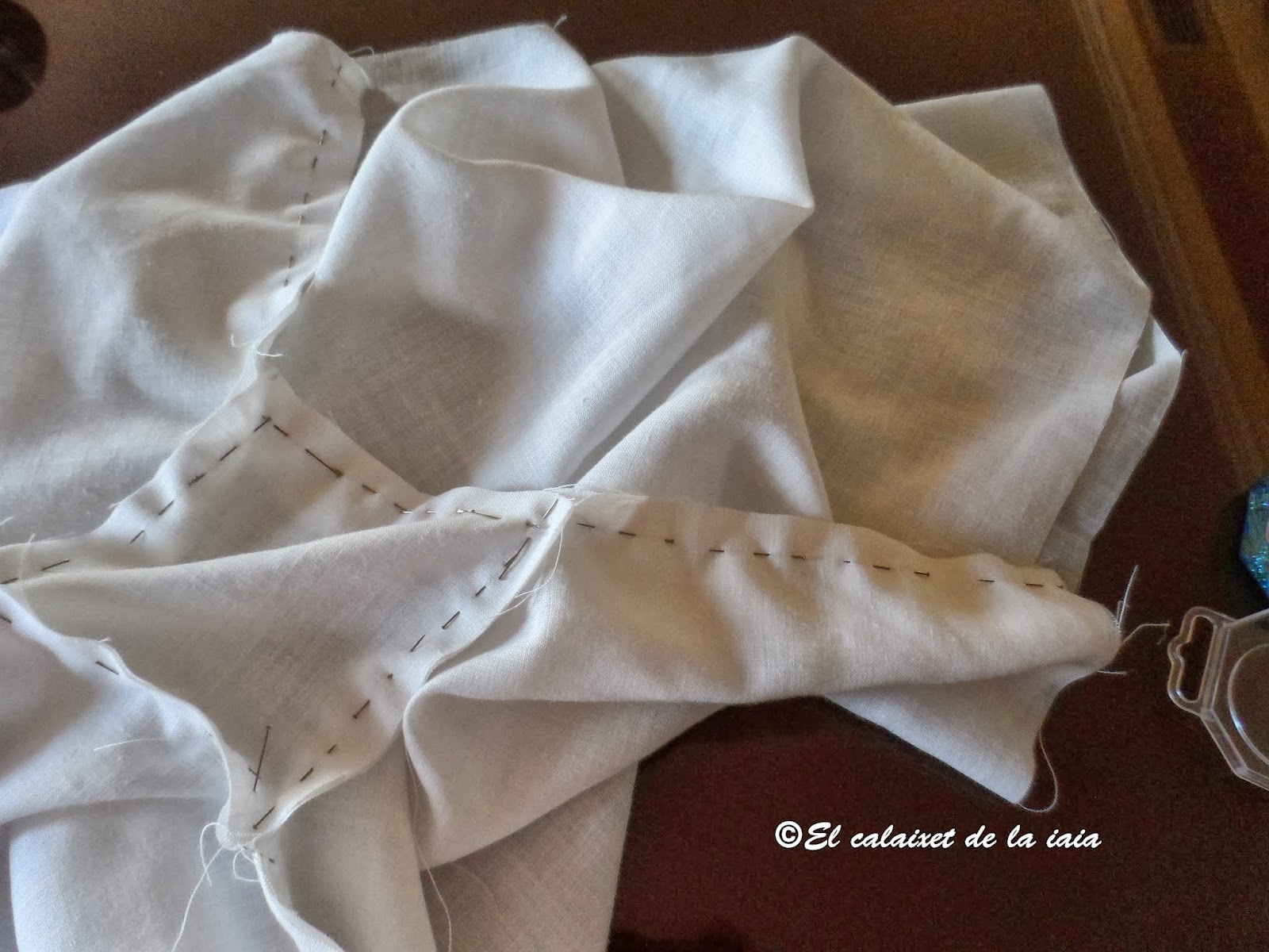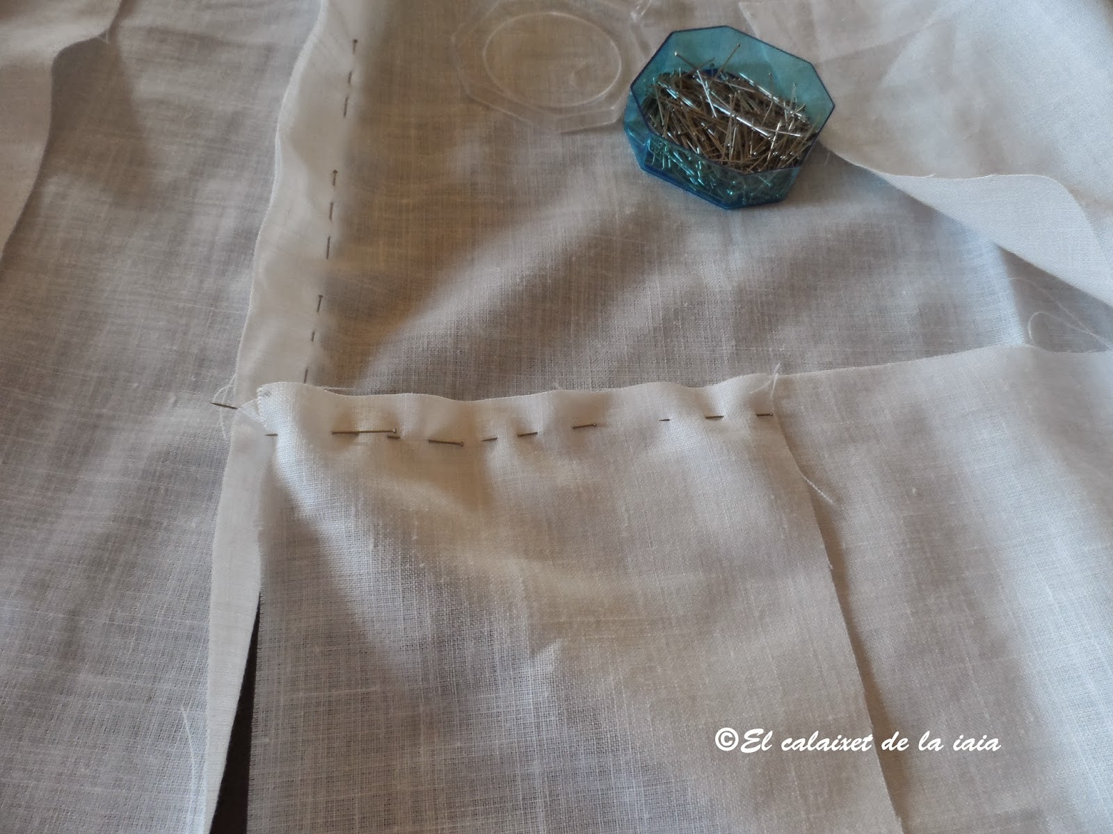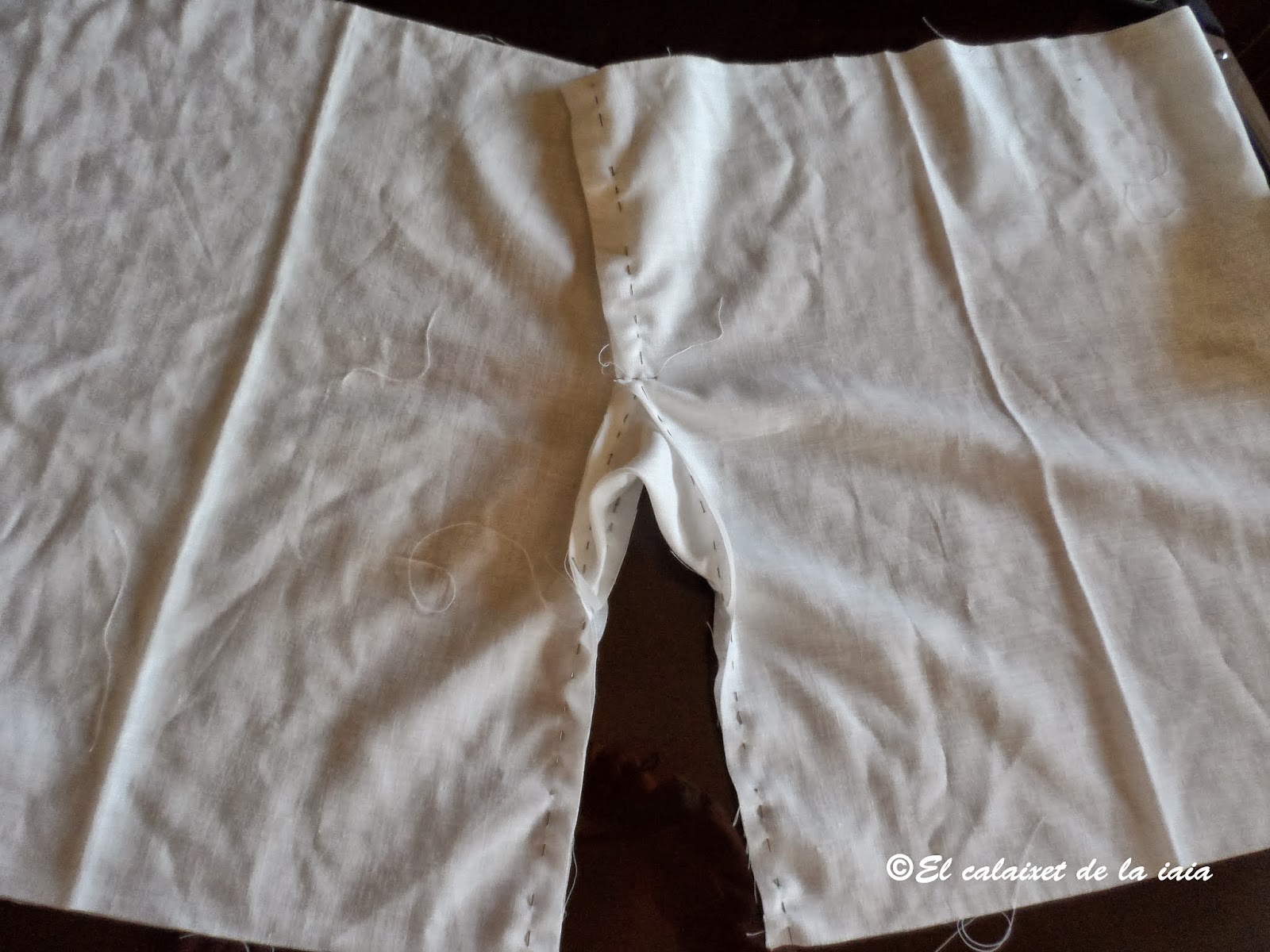 hilvanaremos y de nuevo a la máquina. Si trabajáis con lienzo basto ó «llenç cassolá» os aconsejo que no hagáis costura francesa porque os quedaría muy gruesa. Simplemente coser y por el revés asear con estrafort blanco. Es importante cuando cosemos una prenda que quede lo más perfecta posible, tanto por el derecho, como por el revés. Ahora coseremos la doblez de la cintura para pasar el cordón que fruncirá el saragüell, que suele ser de algodón o una beta, para que no resbale