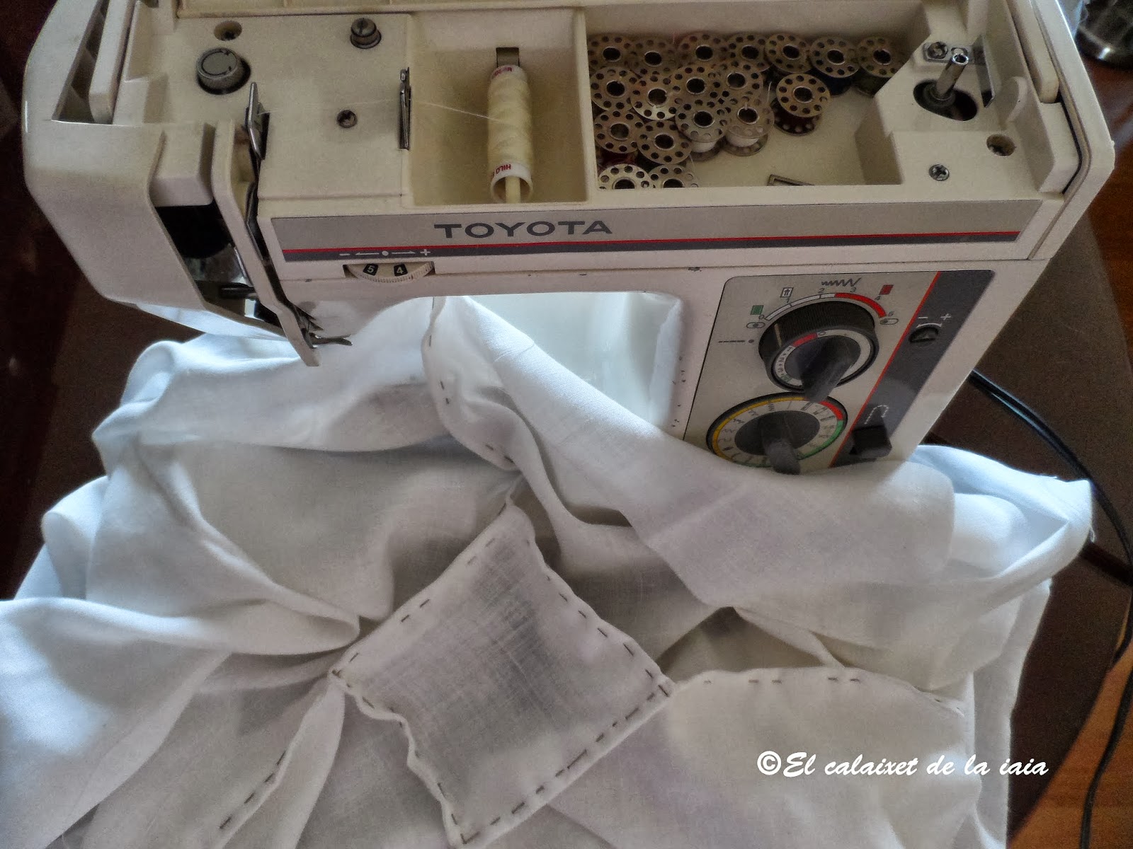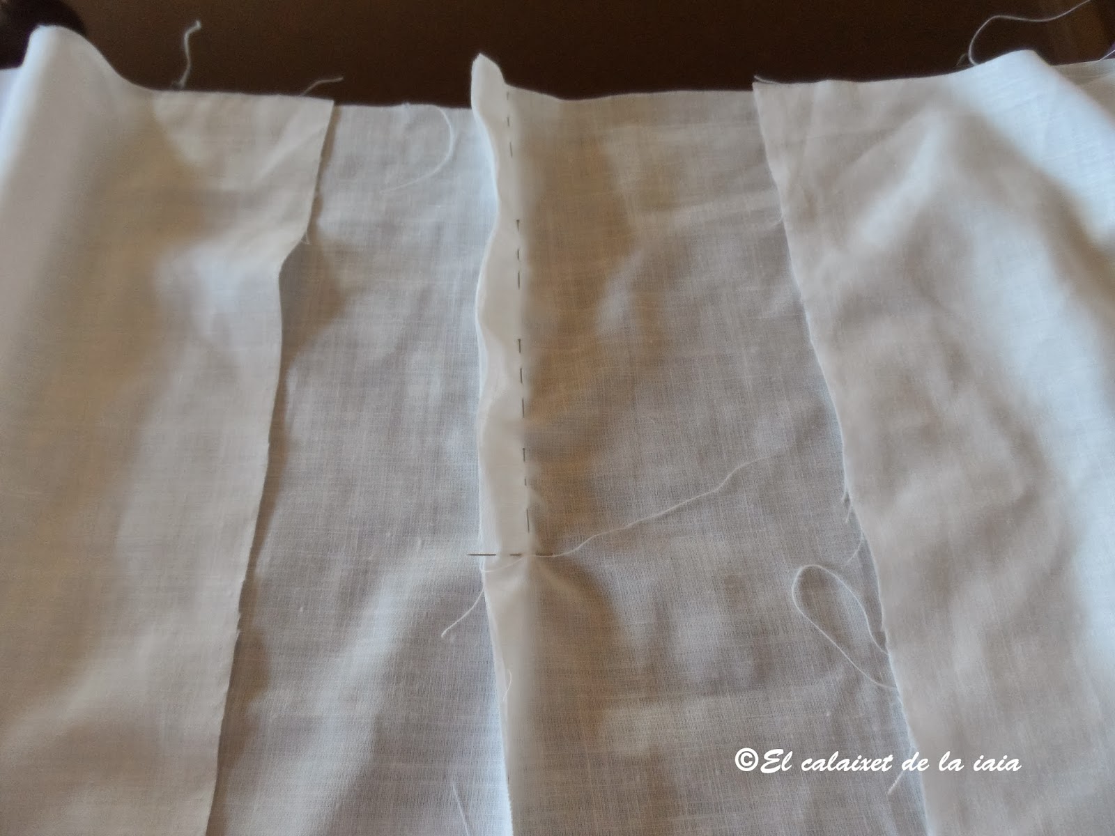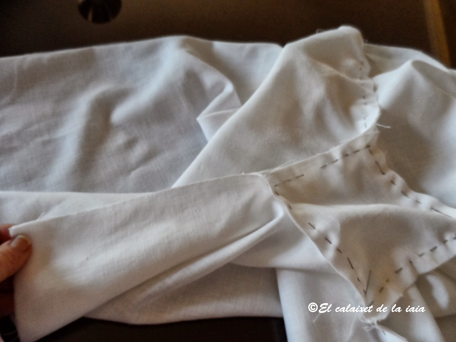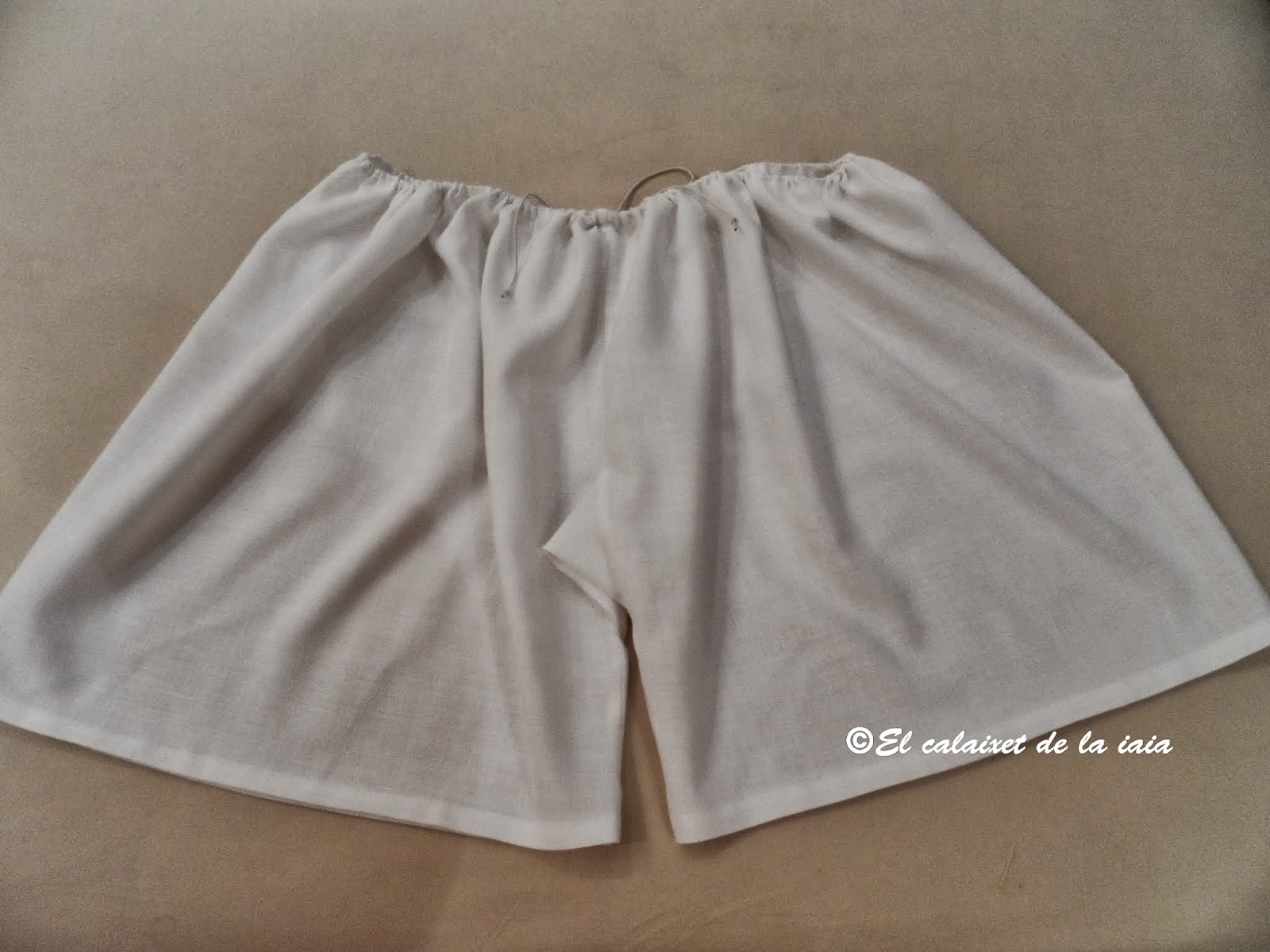 hilvanaremos y de nuevo a la máquina. Si trabajáis con lienzo basto ó «llenç cassolá» os aconsejo que no hagáis costura francesa porque os quedaría muy gruesa. Simplemente coser y por el revés asear con estrafort blanco. Es importante cuando cosemos una prenda que quede lo más perfecta posible, tanto por el derecho, como por el revés. Ahora coseremos la doblez de la cintura para pasar el cordón que fruncirá el saragüell, que suele ser de algodón o una beta, para que no resbale