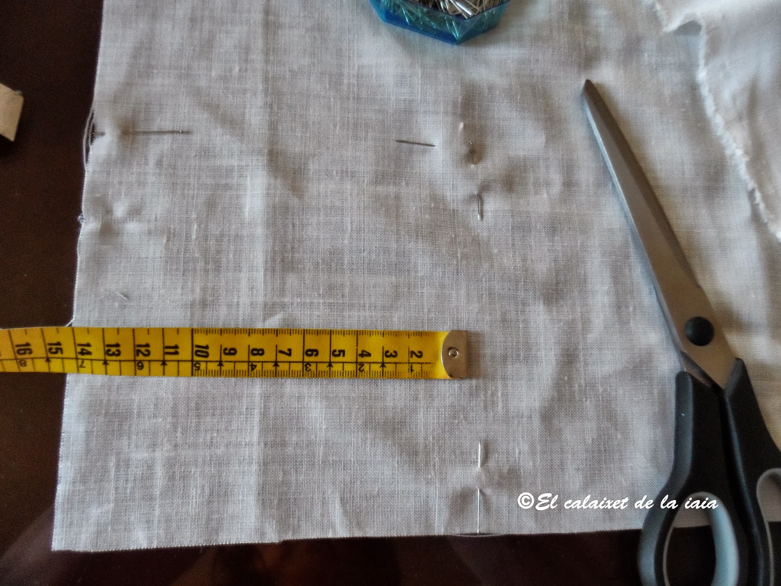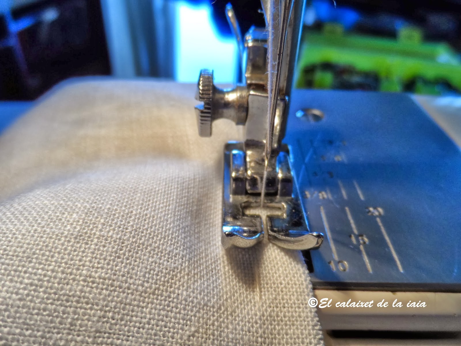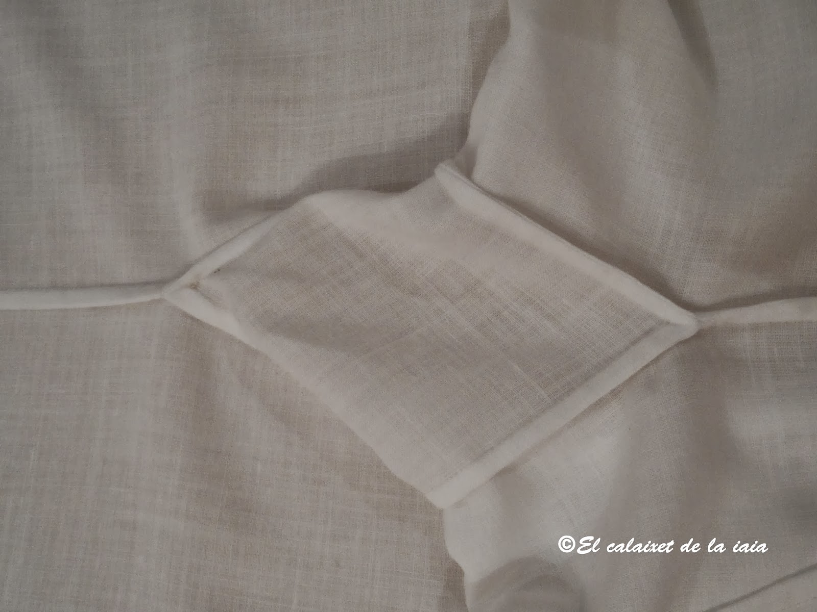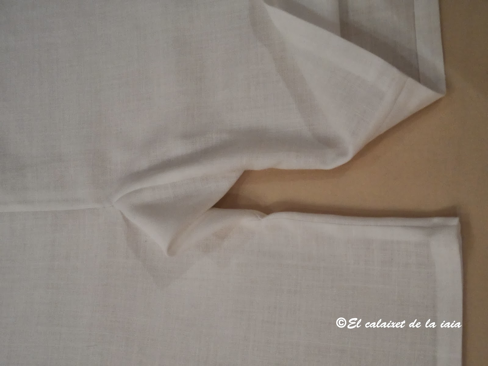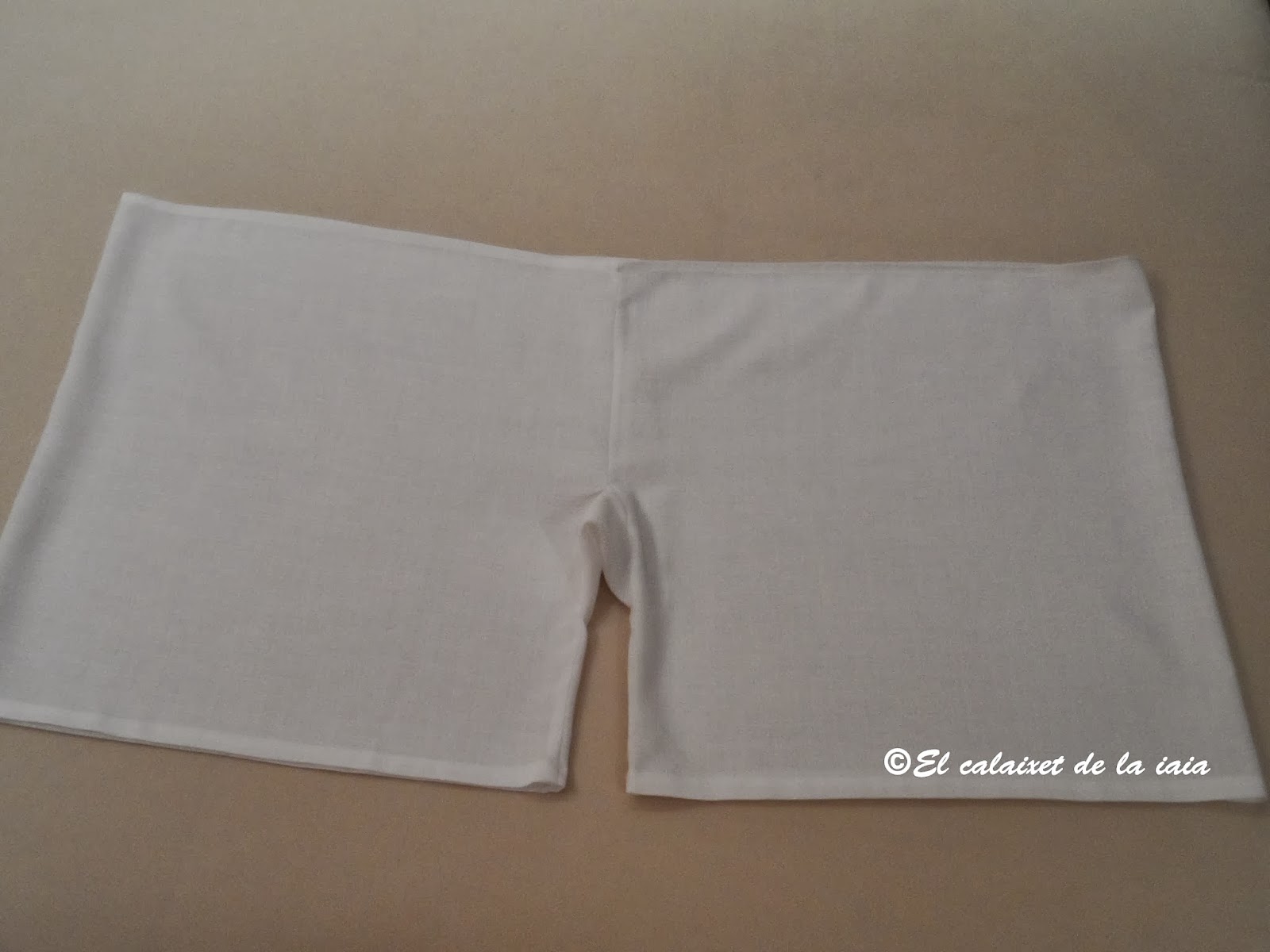hilvanaremos y de nuevo a la máquina. Si trabajáis con lienzo basto ó «llenç cassolá» os aconsejo que no hagáis costura francesa porque os quedaría muy gruesa. Simplemente coser y por el revés asear con estrafort blanco. Es importante cuando cosemos una prenda que quede lo más perfecta posible, tanto por el derecho, como por el revés. Ahora coseremos la doblez de la cintura para pasar el cordón que fruncirá el saragüell, que suele ser de algodón o una beta, para que no resbale