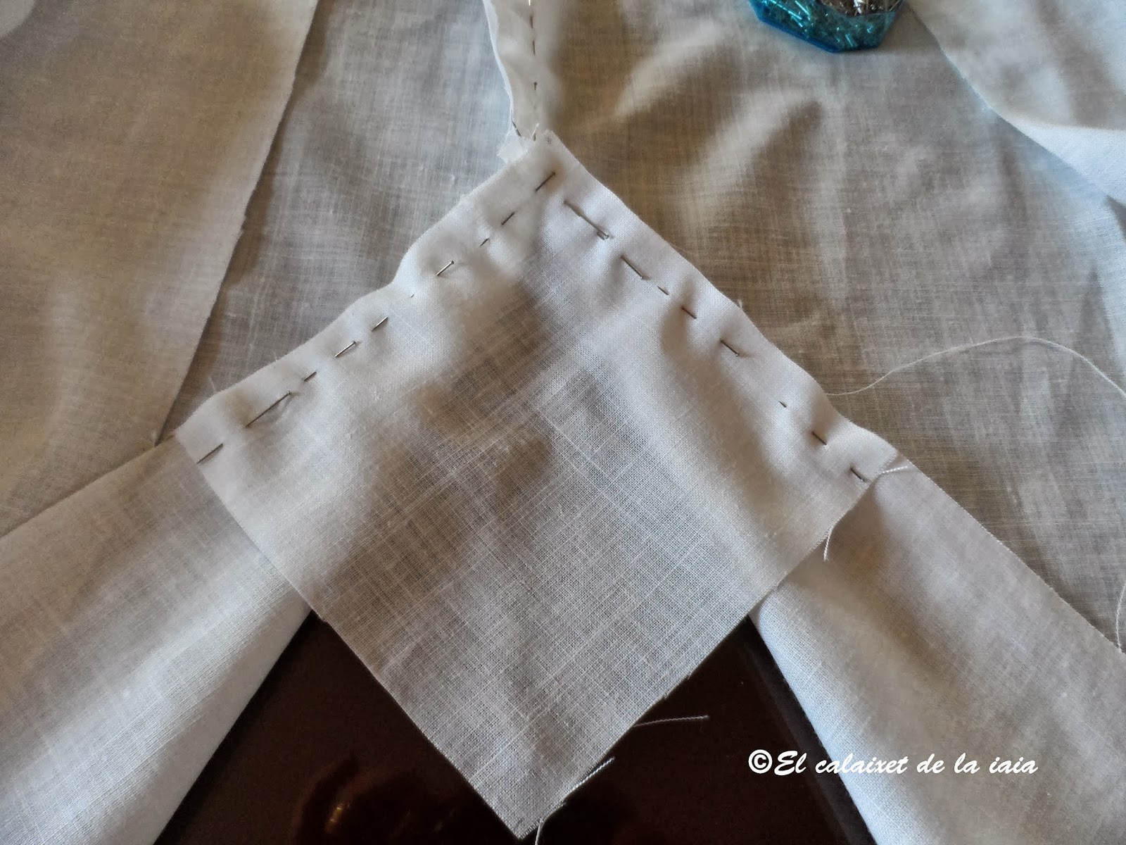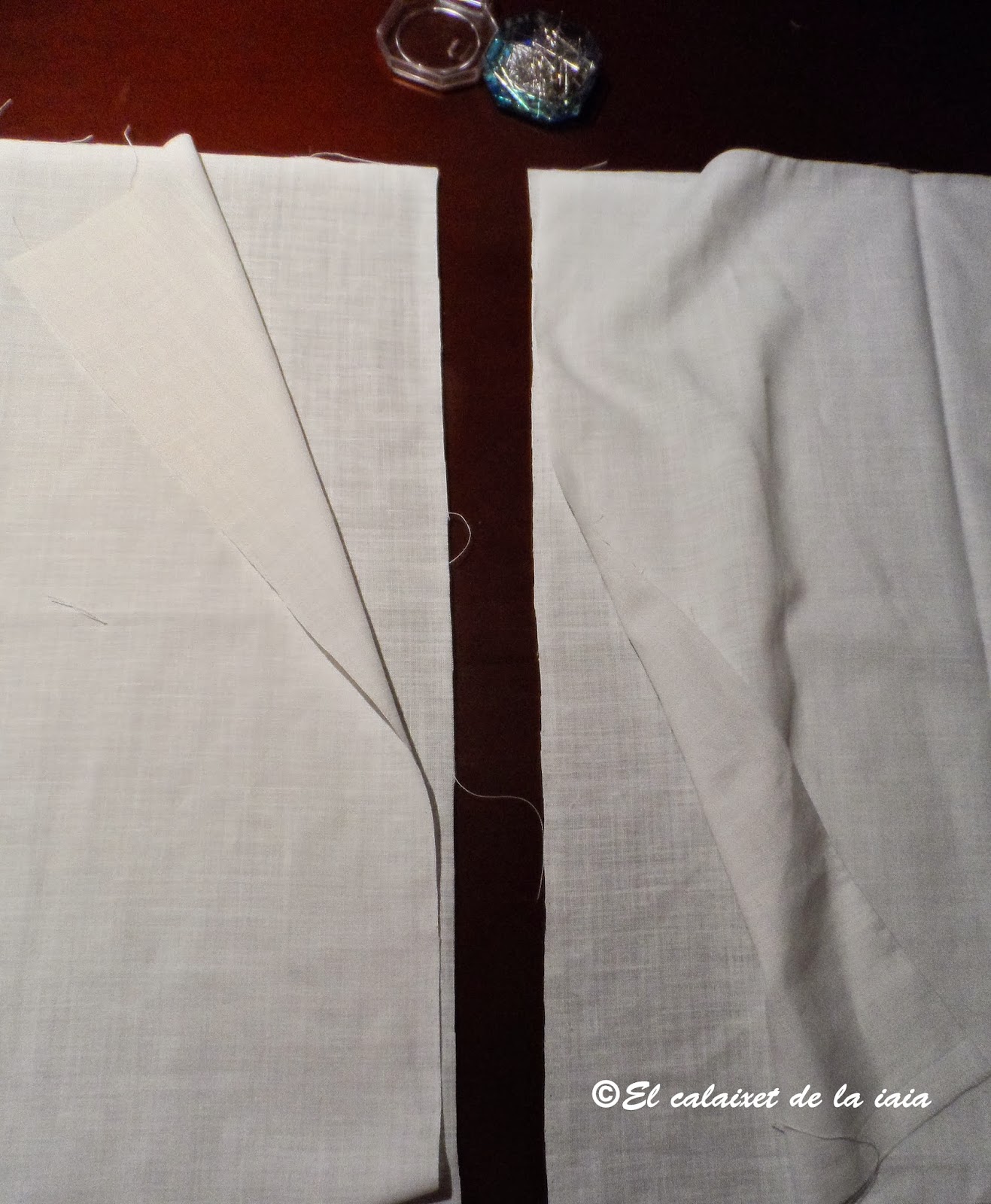 hilvano prácticamente todas las labores, no me arriesgo a que se desplace un alfiler y cargarme en éste caso una tela que es cara, (vamos no como un espolín claro, jeje) aunque en realidad lo hago con cualquier tela aunque sea un retal del mercadillo, prefiero perder ésos minutos, pero si vosotr@s os bastáis sujetando con alfileres, adelante, (también he de deciros que para ser absolutamente correctos, deberían ir cosidos COMPLETAMENTE a mano)