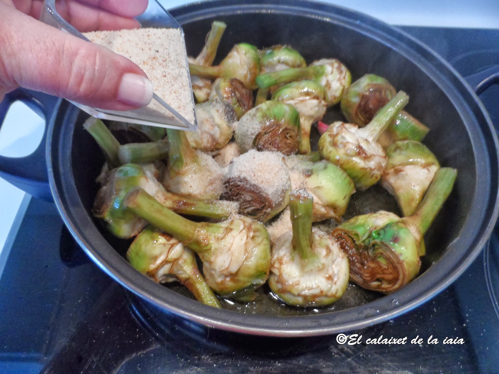 En la cazuela con el aceite caliente freímos un poco las alcachofas