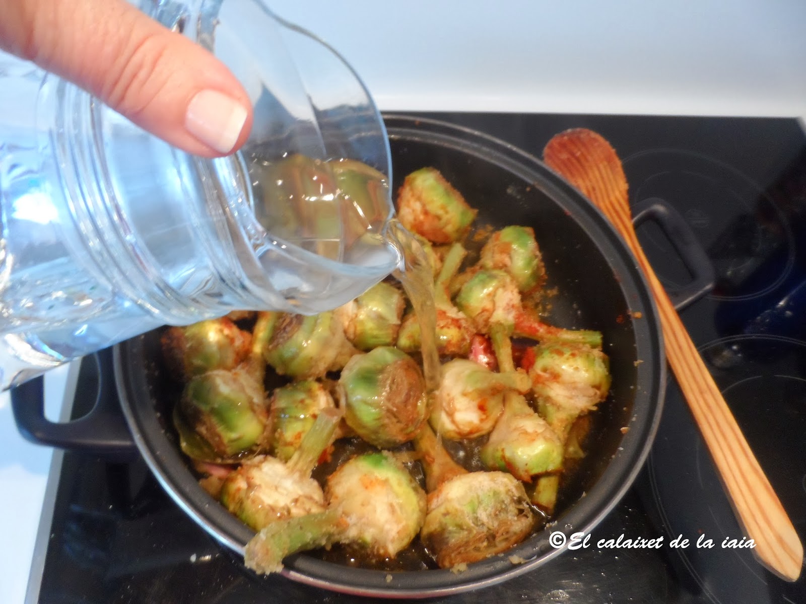 Pelamos y cortamos las alcachofas, y las ponemos a remojo con el zumo de un limón y cubiertas de agua durante un ratito. Como llevo unos días, con problemas en las manos, y estaba en casa, hoy me ha ayudado a pelarlas mi maridín y se ha empeñado en dejar los rabos mas largos, porque dice que quedan más decorativas. Luego se apartan las puntas y listo, yo no le discuto nada jajajajaja 😉
